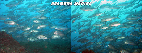 2ダイブ目はパヤオ(浮き漁礁)へ。伊豆でのダイビングではあまり目にすることのない、カマスサワラにシイラの群れ。ツムブリの大群。ツバメウオ。カンパチ。ウスバハギの大群。イシダイやイシガキダイの数はまるでネンブツダイの群れのよう。大興奮でホントご機嫌な海でした。